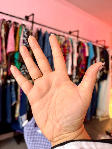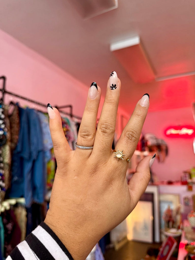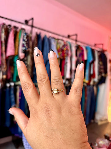 This fidget ring features a spinning sun with rays and a shimmery, faux cabochon at its center. It is fully adjustable and has a clear rhinestone ...