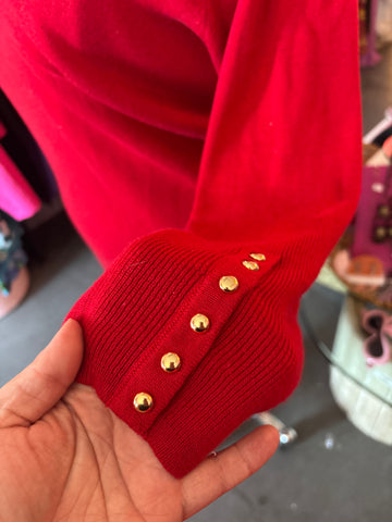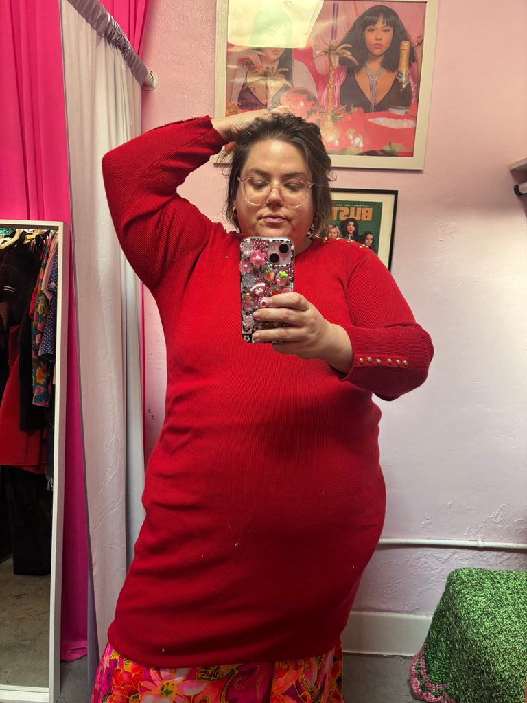 This 80's red knit sweater dress is long sleeve and approximately knee length. There are stud embellishments along the neckline and sleeve. Shown o...
