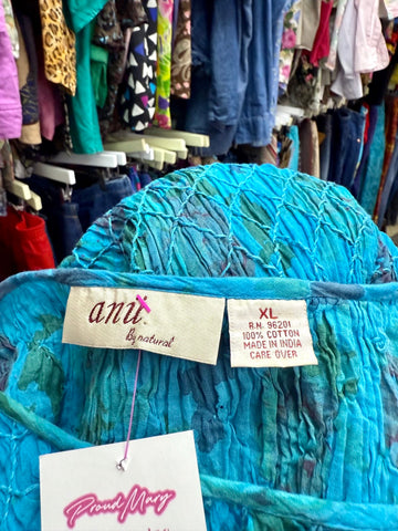 This dress is a rich blue with watercolor pink florals. It has a diamond thread running along the bust that makes it a bit roomier. There's a tier ...