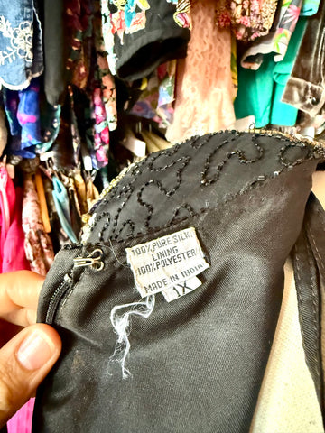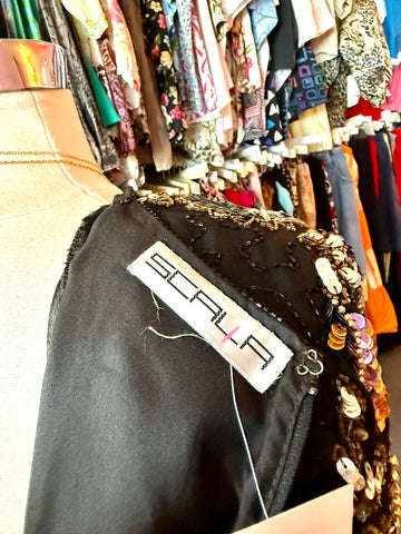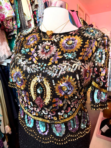 This 80s sequin dream has gold, purple, silver, pink, and blue sequins and beads in shaped that resemble fireworks and flowers. Gold round beads in...
