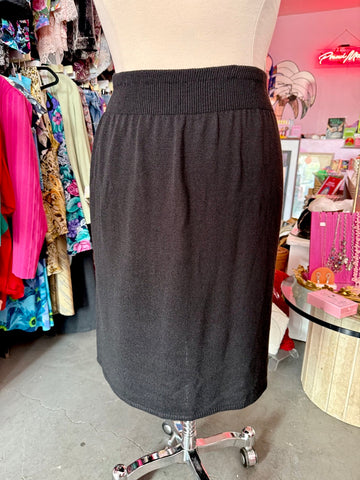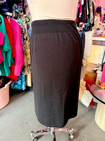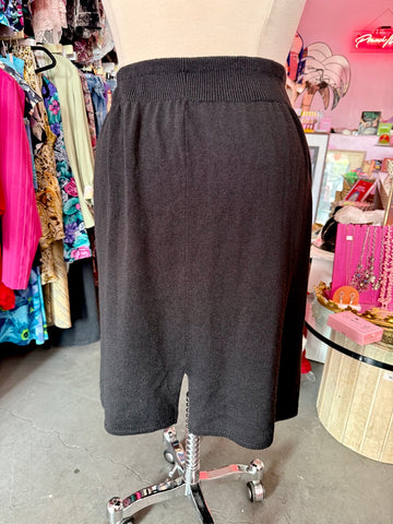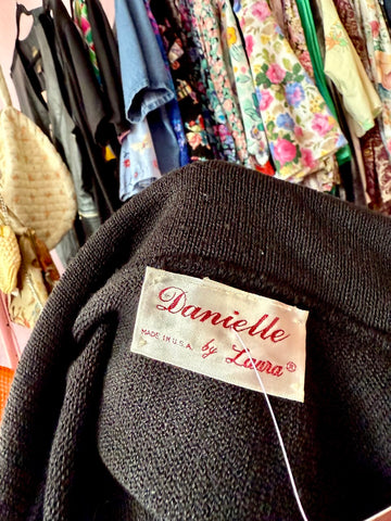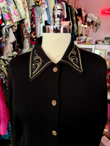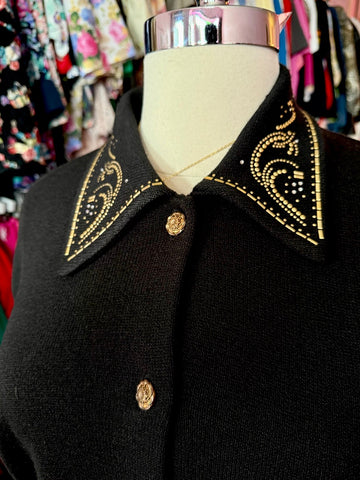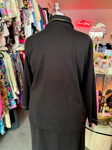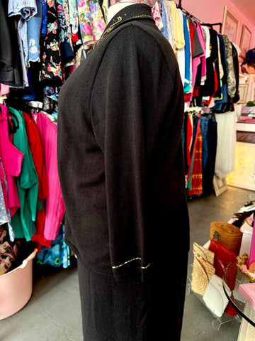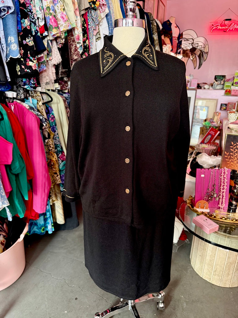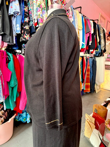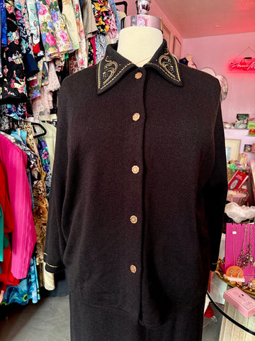 The top of this sweater set can act as a cardigan on its own. It has functional brass buttons with a rose motif. The collar and wrists have gold st...