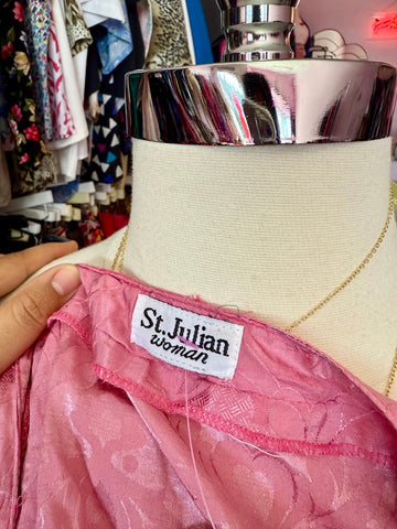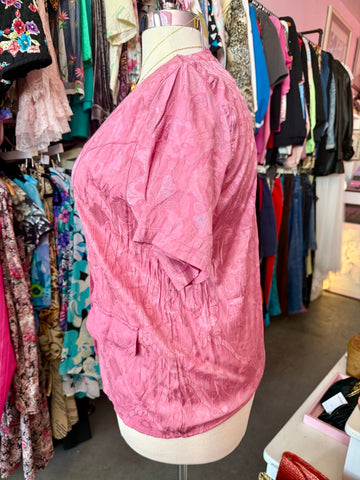 This satin blouse has a gorgeous flower and bow pattern throughout. It has faux pockets and functional buttons down the front. It has a square neck...