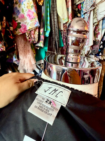 This 80s jacket has sequins in vaguely floral shapes in blue, greens, and pinks surrounded by black beaded squiggles. The collar and hem have small...