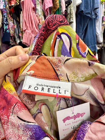 This button up has artys panels of sketched hearts in orange, pinks, purples, yellows, and greens. In between are rust lines of medallions. It has ...