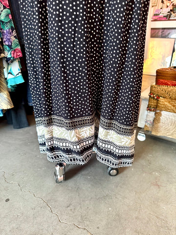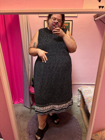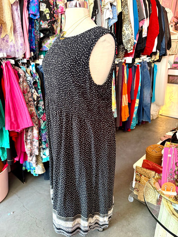 This lightweight, sleeveless dress has a shirred top for maximum stretch and comfort. It is black with white organic polka dots and has a band at t...
