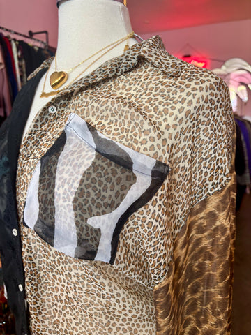 This sheer button up has mixed animal prints along each panel with a black burnout floral pattern in the front and one pocket. Small functional but...