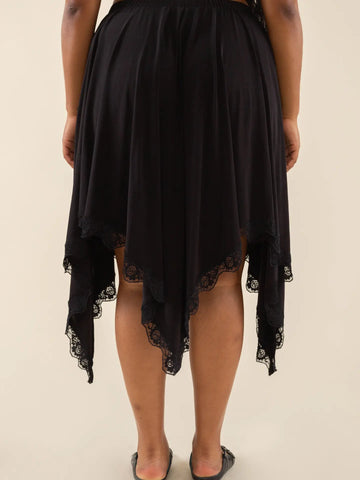 Stretchy black handkerchief skirt with lace trimmed hem. This skirt is perfect for dressing up or down.  The fun cut looks great with a fitted tee,...