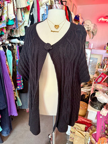 This short sleeve cardigan would look so cute layered over a long sleeve top and mini skirt. It has one knit button snap at the bust. It has a larg...