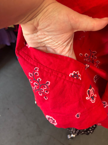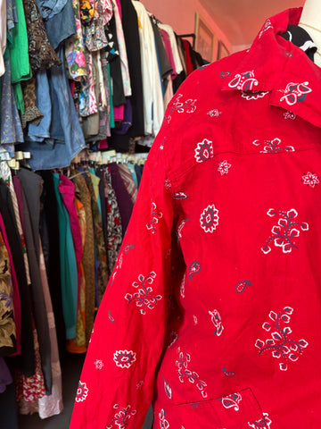 This red bandana print jacket is a lightweight cotton blend. It has metal buttons along the front and functional pockets. Tag: Brand: Graff Lady S...