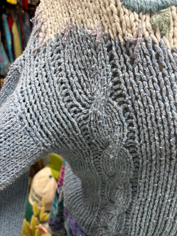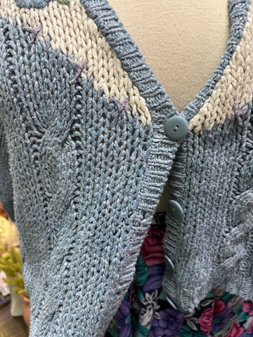 The sweetest 90's knit cropped button up sweater with white detail and florals around the neckline! Long sleeves and cropped length. Fits our dress...