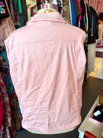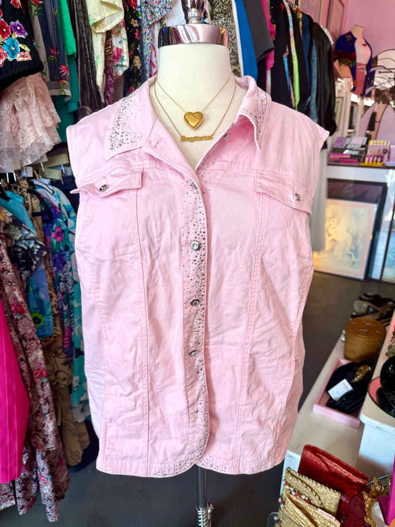 This baby pink vest has studs and rhinestones in a variety of sizes all over the collar and down the center. It has functional, blingy buttons on t...