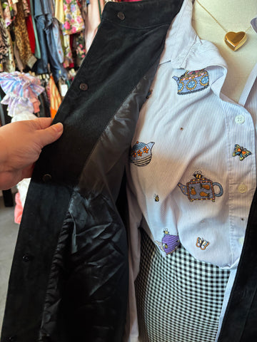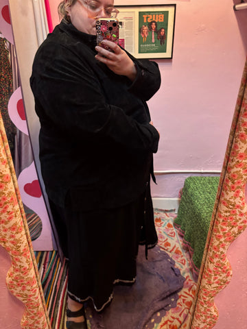 This black suede jacket is a medium-weight and gives model off-duty vibes. It is marked a "men's" size 3X and fits like a 3/4X.  Jessica is shown w...