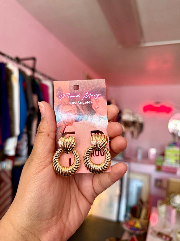 These romantic earrings have a gold heart and a dangling hoop both with a rope texture. Gold color with high shine finish. Details: Imported item ...