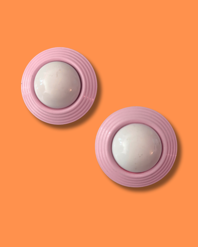 These 80's post earrings have a statement feel with their large size, pink ribbed outer layer. They remind us of art deco home lighting, designer a...