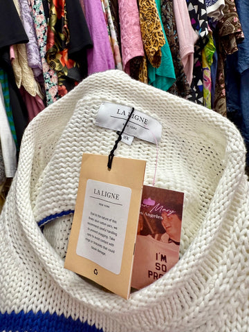 New With Tags. Cozy, stretchy, and soft. This fisherman sweater is white with blue stripes. It has a rolled neckline.Tag: Brand: La Ligne Size: 3X...