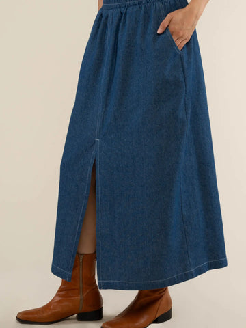 A more simple twist on a denim skirt. Front slit with an elastic band at the waist for comfortability and fit ease. The skirt has side pockets and ...