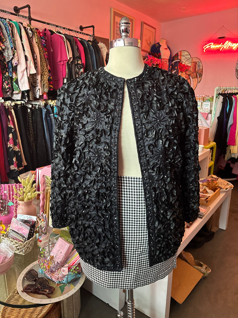 This Black Midi jacket has all over frill and beading details. It's ornate, it's over the top, it's just right! Pair with statement bottoms to lean...