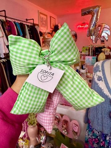 This jumbo, puffy, bow keychain is made of vintage fabric and filled with fabric scraps and secondhand polyfill. Handmade in Los Angeles by Shop So...