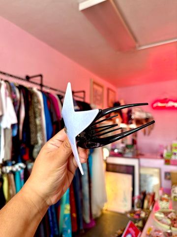 This claw clip has the coolest shape! It features a large wavy star with a silver rhinestone heart in the center. It has a black clip reminiscent o...