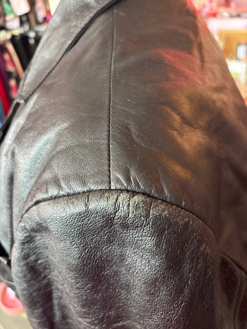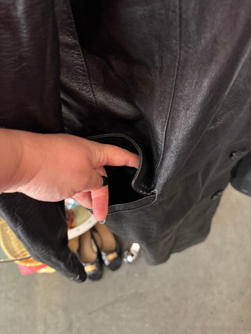 This vintage leather button down jacket has a boxier "menswear" feel in a classic chic silhouette. Button down front with a slit in the back. The s...